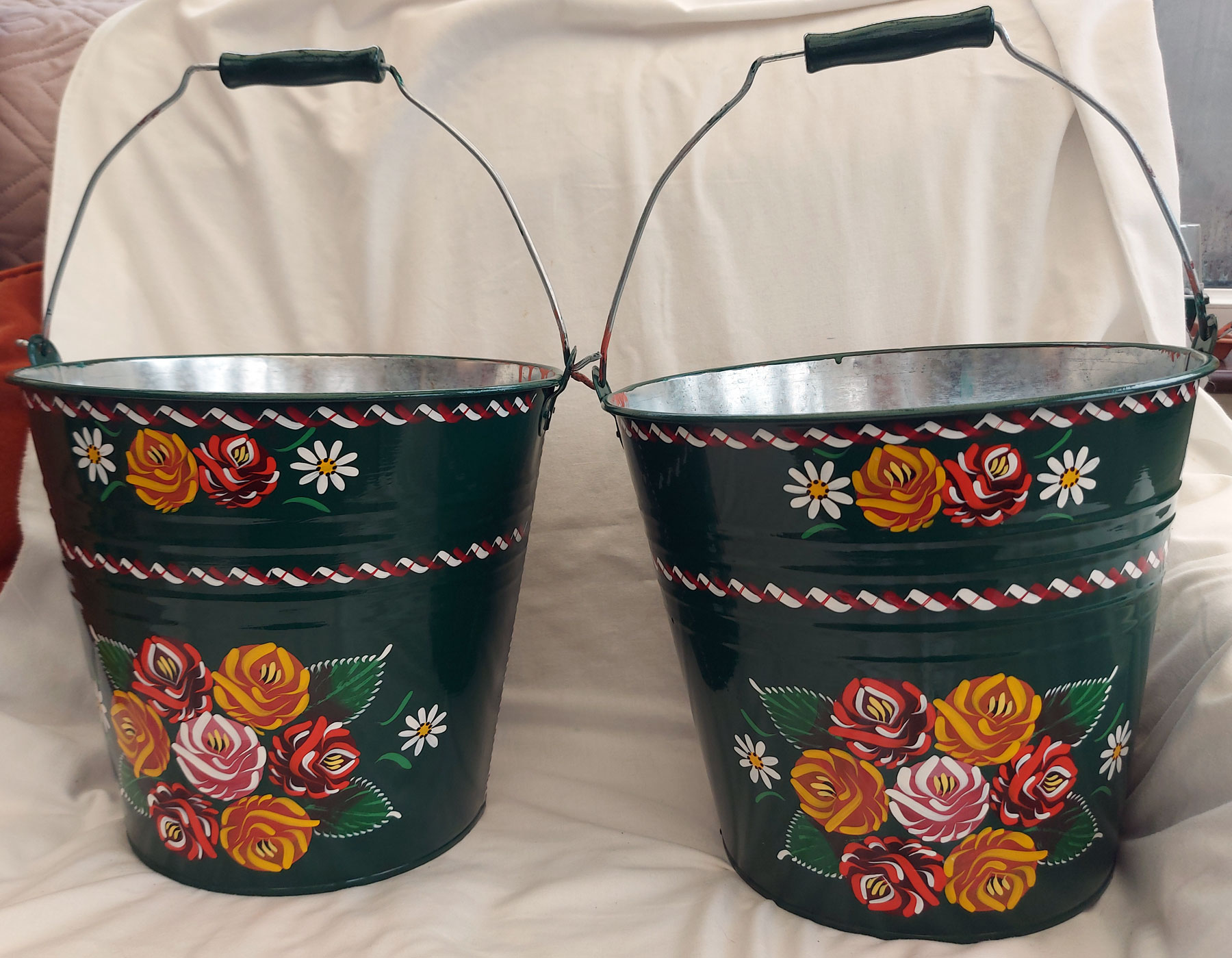 ![]() small pale orange metal buckets |